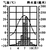 | A.该地年温差约10℃ B.年降水总量在500毫米以下 C.7、8月份降水量非常集中 D.夏季凉爽,冬季温暖 |