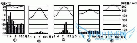 | (1)请写出①②③④⑤气候图与上图中A、B、C、D、F五地的对应关系: A为 ;B为 ;C为 ;D为 ;F为 。 |