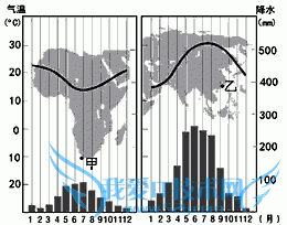 读下图,完成表中甲、乙两地的比较。甲地乙地所属大洲7月降水量(mm)1月均...[世界主要气候类型 ]