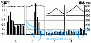 试题答案: A热带雨林气候;B热带季风气候;C温带海洋性气候;D地中海气候