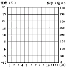 | (1)该地的气温年较差为________℃,降水量主要集中在________(夏季或冬季)。 (2)由资料和图可以判断该地区的气候类型是:______________________________。 (3)绘图。 ![]() |