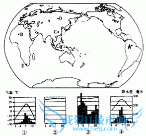 阅读下图,回答问题。(1)请分别写出①②③④四幅气候图与与图中A、B、C、...[世界主要气候类型 ]