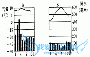 读下边两幅气温和降水图,完成下列内容。(1)A、B两地气温年较差大的是___...[世界主要气候类型 ]
