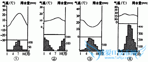 下图表示世界四个地区的气温降水状况。读图回答1—3题。1、位于热带地区的