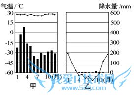 读甲、乙两地气温、降水量的月份分配图,回答1—2题。![]() |