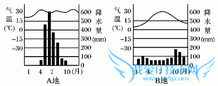 试题:读降水示意图,回答下列问题。(1)A、B两地中,年降水量较多的是_____,该地_____月降水量最多。(2)A地位于五带中的______带,B地位于________带。(3)A、B两地中,气温年较差-地理试题及答案
