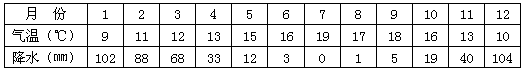 | 下表是某地的各月气温和降水,阅读后回答: 该地气候特点是 |