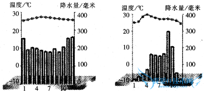 | 图一、图二是两类气候各月气温和降水量分配图,根据图形回答问题。 |