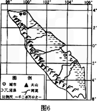 试题答案: (1)经度范围:98°E~106°E,或东经98度~东经106度;纬度范围:6°S ~4°N,或南纬6度~北纬4度。