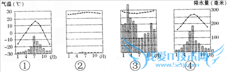 试题:读下图,回答问题。(1)①②③④四图分别表示上图A、B、C、D四地的气候特点,则A对应_______图,B对应_______图,C对应_______图,D对应________图(填数字序号)。(2)A处为_______-地理试题及答案