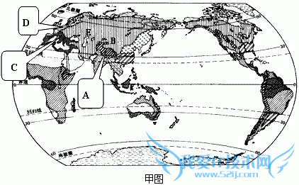 | (1)在甲图中,小芳发现地处亚欧大陆中纬度地区的A、B、E三地气候变化有以下规律:由A到B到E, 气温年较差逐渐加大,而年降水量却呈现出递减趋势。请你解释造成这种现象的主要原因是什么? 。 |