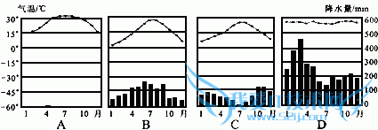 试题:根据四地的气温曲线和逐月降水量图判断,在我国台湾广泛分布的气候类型是[]A、AB、BC、CD、D-地理试题及答案