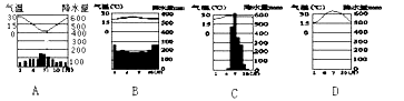 2010年第19届南非世界杯足球赛于6月11日隆重开幕,位于南半球的开普敦是南非的港口城市,夏季炎热干燥,冬季温和多雨。下图中与其气候特征相符的是![]() |