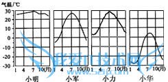 来自热带、温带和寒带的四位学生是小明、小军、小力和小华,他们生活所在地的气温变化曲线图,这四位学生在一起进行了交流。读图,完成下列小题:![]() |