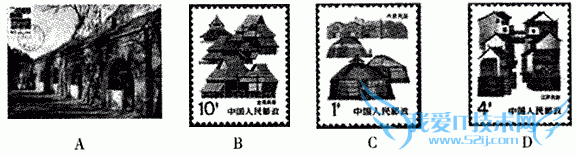 2、下列四幅民居邮票图中,反映我国江南水乡特点的是![]() |