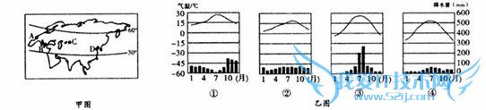 读甲、乙两图,完成下列各题:(1)分析乙图中四种气候类型的气温降水状况