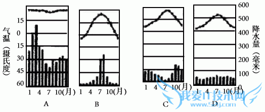 试题:读下图,回答下列问题:(1)A、B、C、D四地中,属于热带的是______;冬季有结冰现象的是______。(2)四地中,气温年较差最大的是_____地;年较差最小的是_____地。(3)四地中属于-地理试题及答案