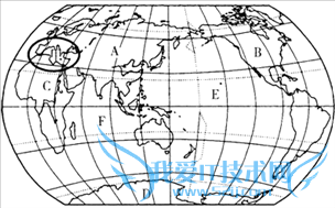 | (1)填写上图中字母代表的大洲和大洋的名称. A___洲,B___洲,C___洲,D___洲,E___洋,F___洋 |