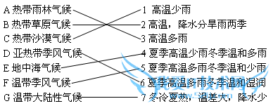 试题:连线:A热带雨林气候B热带草原气候C热带沙漠气候D亚热带季风气候E地中海气候F温带季风气候G温带大陆性气候1高温少雨2高温,降水分韩雨两季3高温多雨4夏季高温少雨冬季温和多雨-地理试题及答案