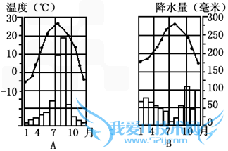 下图是A、B两地各月气温变化曲线图和各月降水分配图,读图回答:(1)两地