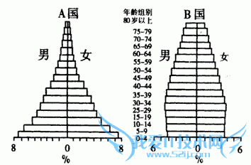 | 读下面A、B两国人口金字塔图,分析回答问题。 |