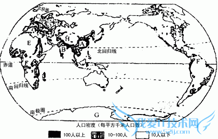 试题:读世界人口分布图,回答:(1)图中A、B_____________、C_____________、D四地,是世界上人口最稠密的地区。它们的共同特点是_______________________________________________-地理试题及答案