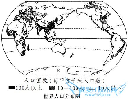 读图,完成下列问题。(1)图中A、B、C、D四地人口稀少,其主要原因:A地是...[世界的人口 ]