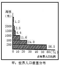 试题:世界人口的分布是不均匀的,但又有一定的规律。读下图,完成下列各题。(1)据甲图分析,从地形类型来看,世界56%左右的人口分布在海拔200米以下的_______________地区。(2)据-地理试题及答案