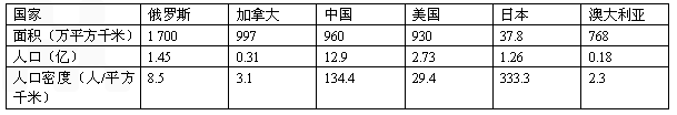 试题:读下列六个国家的人口数量分布图,完成表格的内容:国家俄罗斯加拿大中国美国日本澳大利亚面积(万平方千米)170099796093037.8768人口(亿)人口密度(人/平方千米)-地理试题及答案