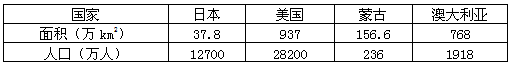 试题:下列表格中的资料显示,人口密度最大的国家是[]A、日本B、美国C、蒙古D、澳大利亚-地理试题及答案