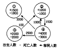 | (1)人口自然增长数一人口出生数一人口死亡数,请计算出以下两个城市的人口自然增长数: ①________; ④________ (2)①~④城中,人口自然增长呈负增长的有__________。 (3)③城人口增加的原因是__________________________。 (4)④城人口共减少了_______人。 |