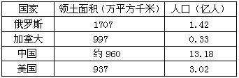 试题:下表中人口密度(2007年)最小的国家是[]A.加拿大B.俄罗斯C.美国D.中国-地理试题及答案