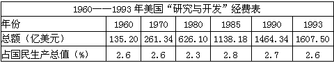 试题答案: ① 美国政府重视发展科技,利用高新技术推动经济的发展,这是它二战后一直是世界头号经济大国的重要原因。从比率变化不大、但经费总额持续增长这一现象可看出,美国经济基本处于持续发展状态。