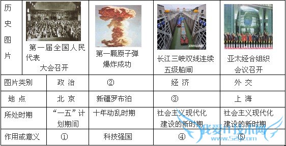 试题:为庆祝新中国成立60周年小明同学收集整理了建国以来一些有代表性建设成就的图片资料,并制成知识结构表。在表格中标有序号的空白处,小明不知怎样归纳,请你作为合作学习的伙-历史试题及答案