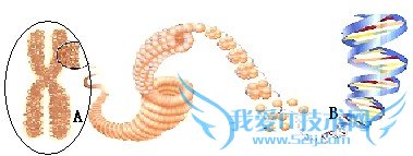| 下图中,A是_________,它主要由________和_________组成;B是双螺旋结构的______,上面有特定遗传信息片段的是___________。正常人体的生殖细胞中含有A的数量是___________条。 |