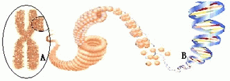 | 下图中,A是_________,它主要由__________和___________组成。B是双螺旋结构的________,上面有特定遗传信息片段的是__________。 |