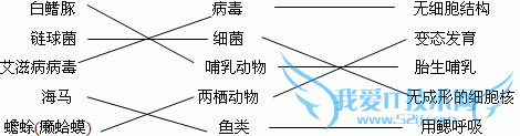 试题:请用连线把下面的生物归入它们所属的生物类群中,并把生物类群与它们的特征相连:白鳍豚病毒无细胞结构链球菌细菌变态发育艾滋病病毒哺乳动物胎生哺乳海马两栖动物无成形的细-生物试题及答案