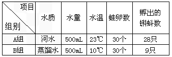 | 某兴趣小组就“不同水质对蛙卵孵化的影响”进行了探究,其实验记录如下表 |