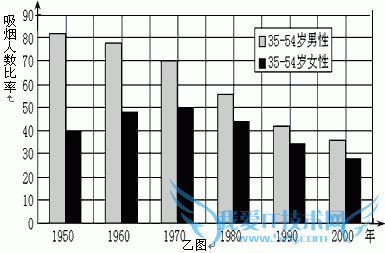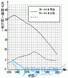 甲图为1950-2000年间,某国35-54岁年龄段的人死于肺癌的人数比率(死于肺癌...[了解自己,增进健康 ]