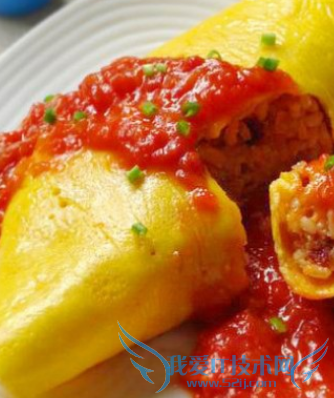 18.将适量的番茄炒饭置于蛋皮的1/3处