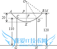作OF⊥CD,垂足为F,交AB于点P,交狐AB于E,连接OB、OD