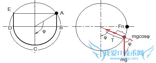 如果释放时绳与水平夹的锐角在水平线之下或水平(如右图示):fn=T-mgcosφ